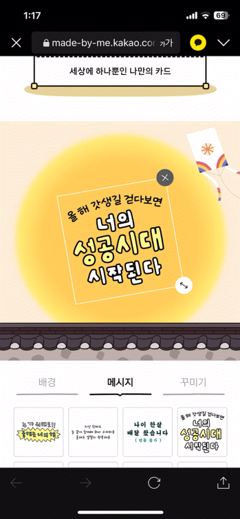 오늘은 카카오톡 설 인사말 만들기에 대해서 알아보았습니다. 디자인 쪽으로 재능이 없어도 귀엽고 깔끔한 설 인사말 카드를 만들 수 있으니 이번에 한번 만들어 보시길 바랍니다.