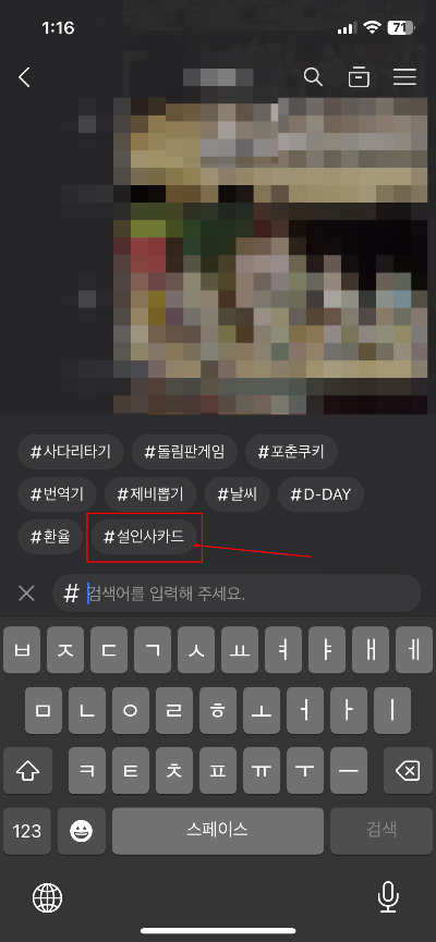 1. 카카오톡 채팅방에서 #을 눌릅니다. 여러가지 기능중에 #설인사카드 를 터치합니다.