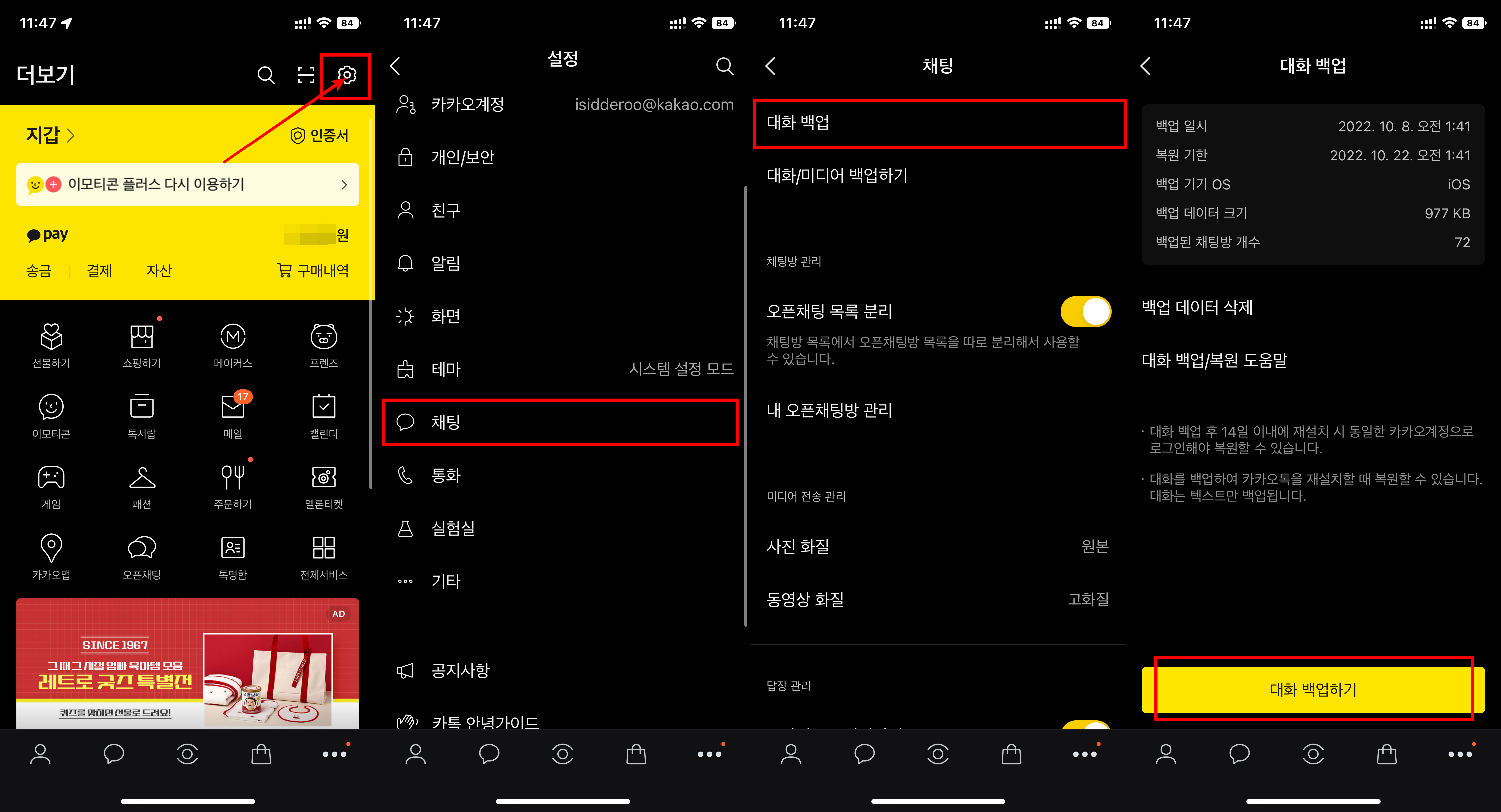 카카오톡 더보기 - 톱니바퀴 설정 - 채팅 - 대화 백업 - 대화 백업하기