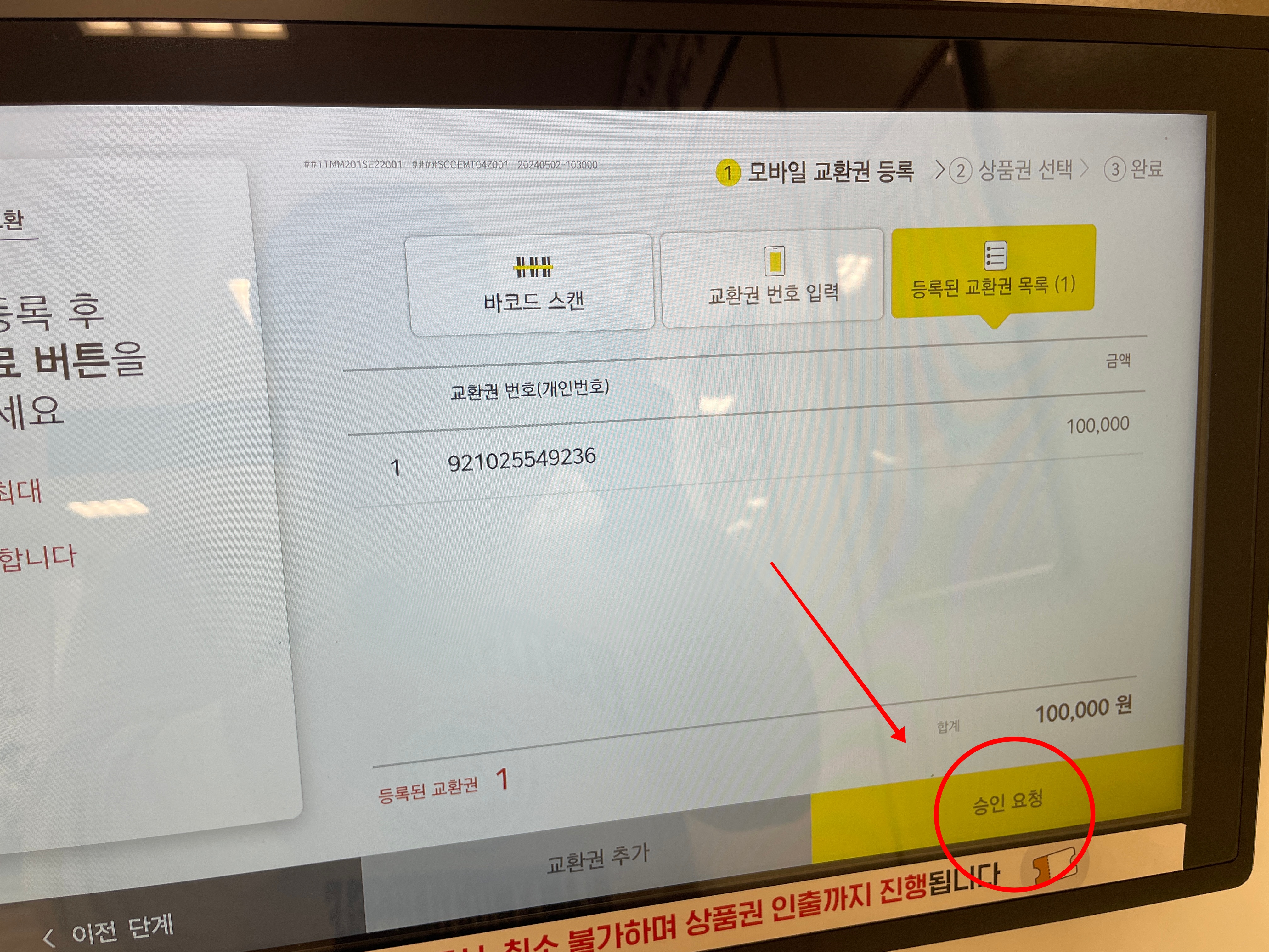 ④ 교환을 하게 된 상품권을 확인할 수 있습니다. 원하는 교환권을 승인 요청 눌러줍니다.