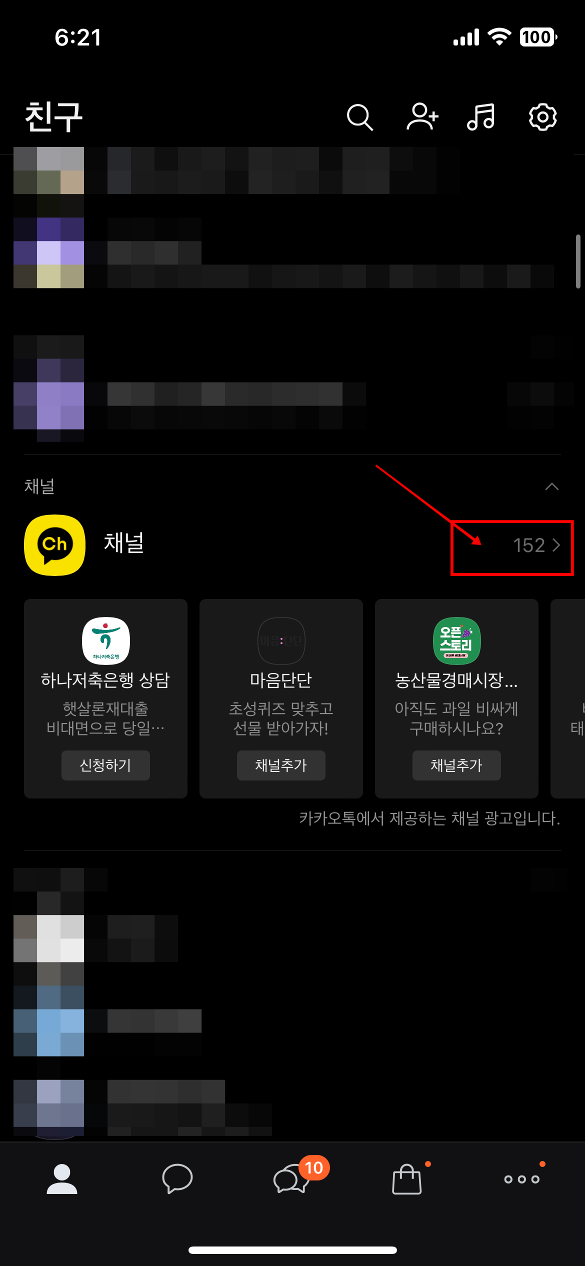 1) 친구 목록에서 채널을 누릅니다.