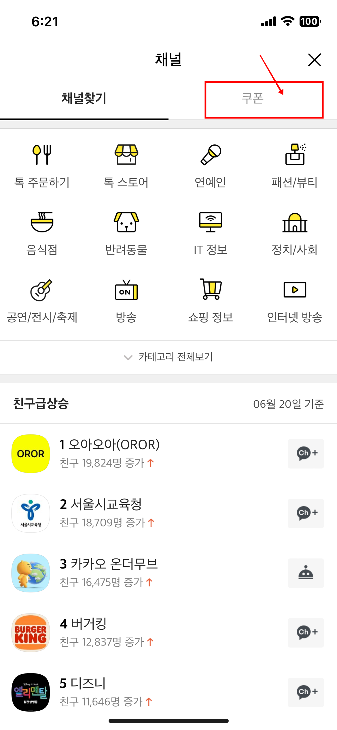 3) 채널에서 상단 쿠폰 메뉴로 들어갑니다.
