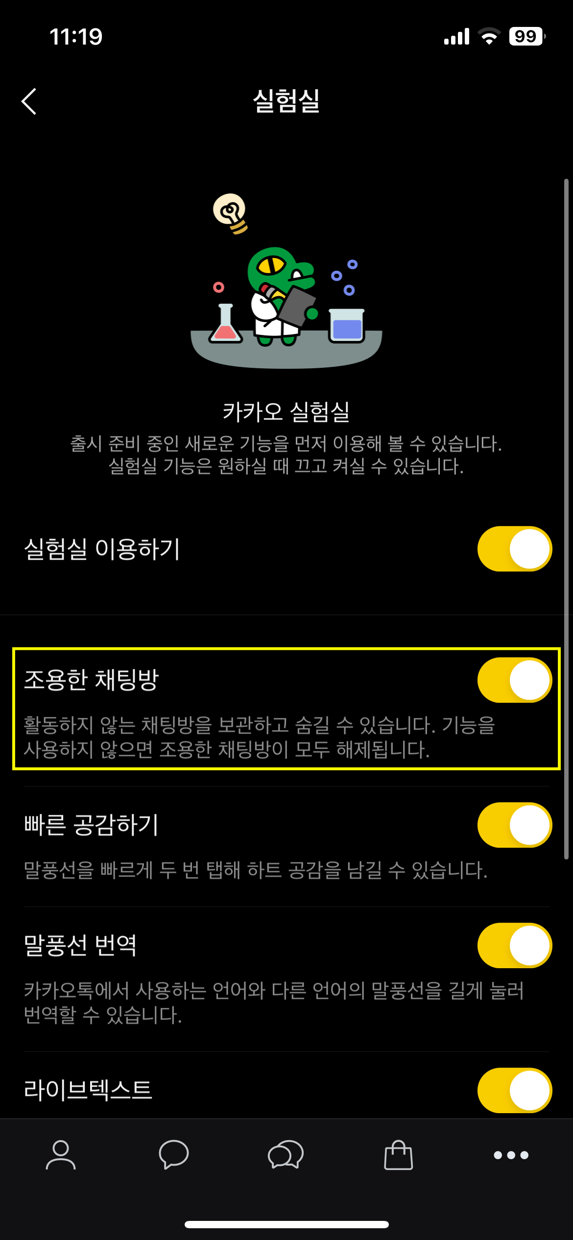 조용한 채팅방을 만들기 위해서는 기본적으로 조용한 채팅방 만들기 설정을 해야합니다. 조용한 채팅방은 최신 카카오톡 버전에 적용이 된 설정으로 기본적으로 업데이트가 되야합니다. 최신버전 업데이트 후 실험실에서 기능을 활성화합니다. 설정하는 방법은 아래를 참고하세요.