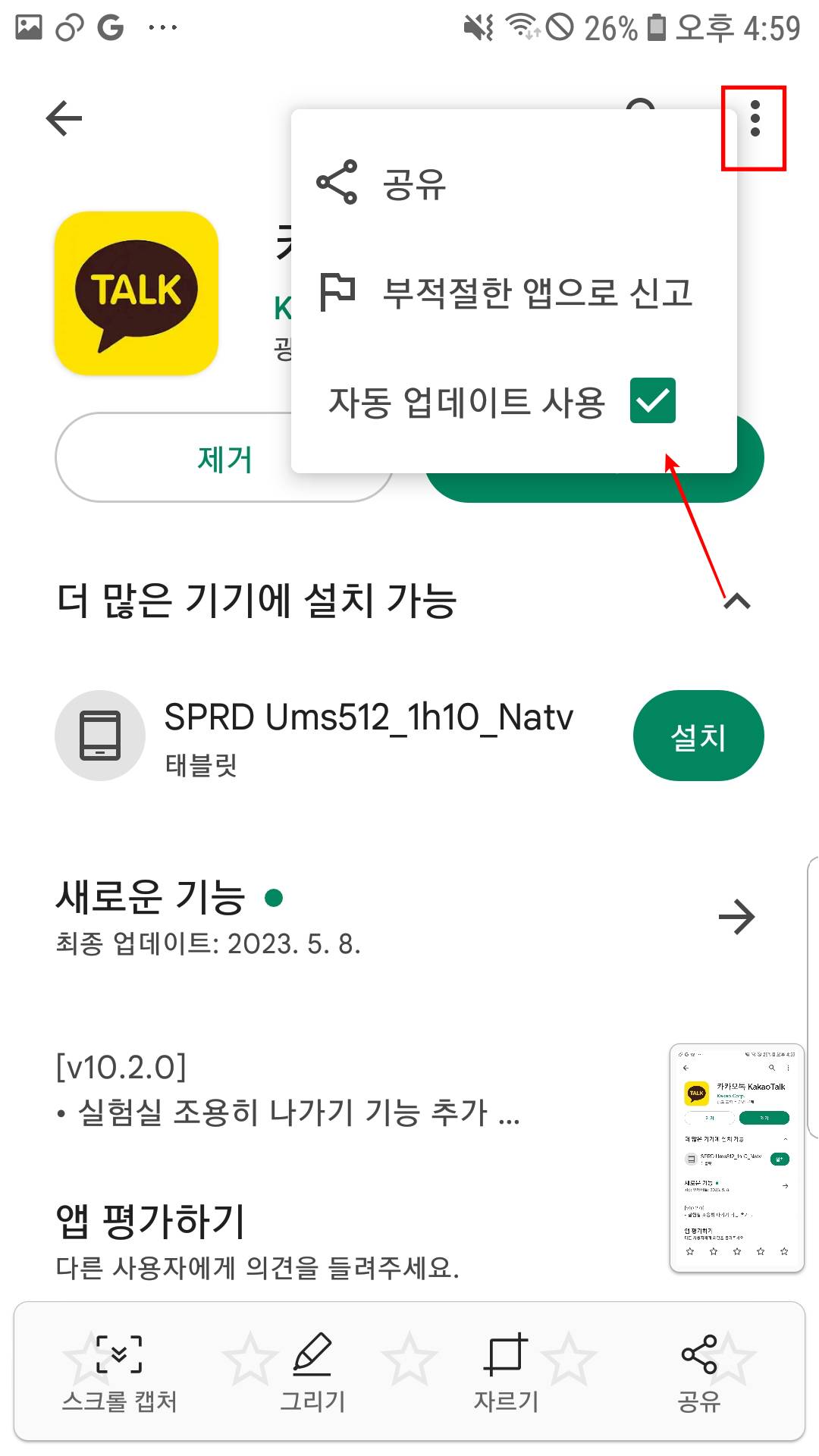 2) 구글 플레이스토어 - 카카오톡 검색 - 상단 점 세개 - 자동 업데이트 사용 체크