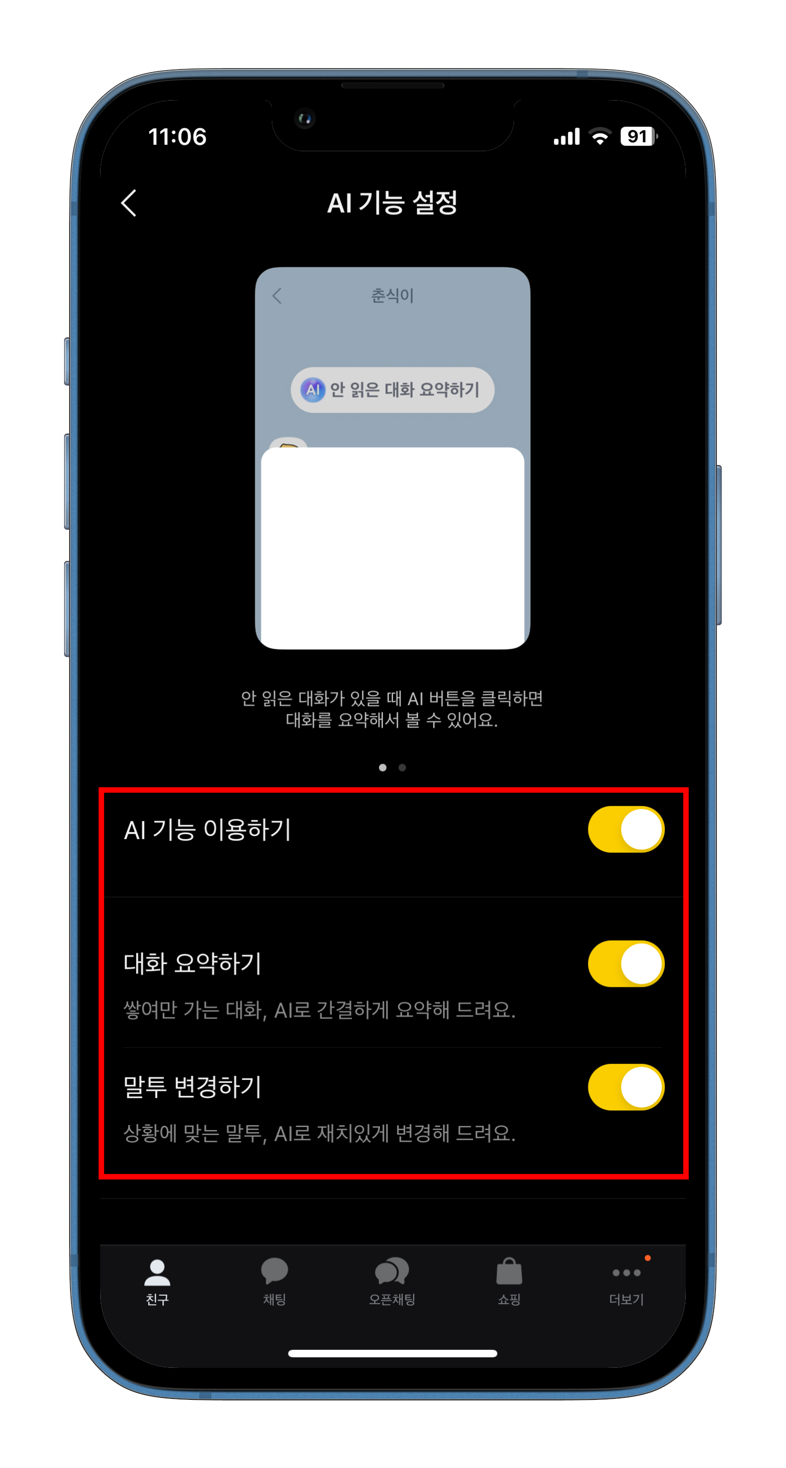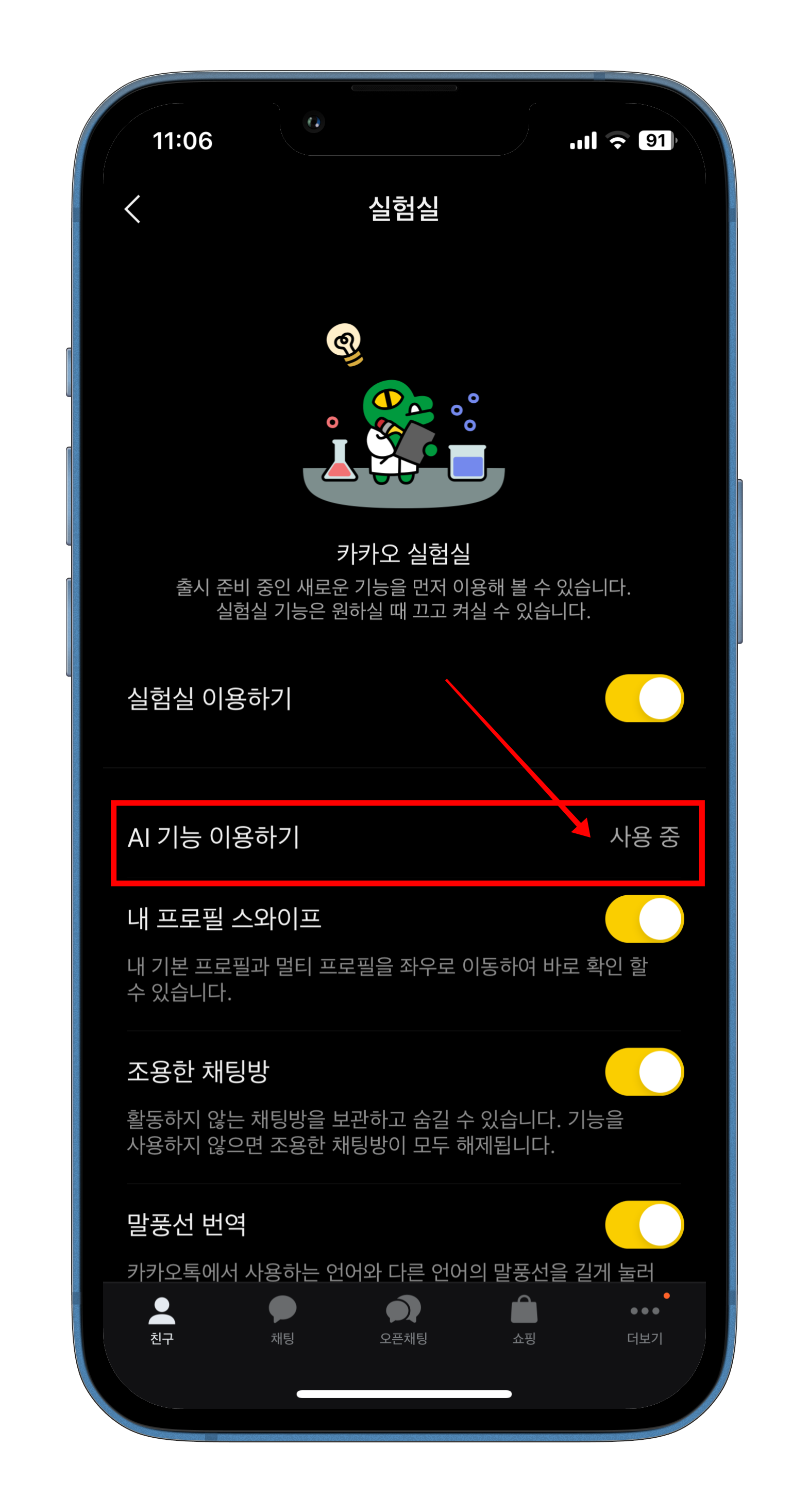실험실에서는 카카오톡에서 제공하려는 기능들을 여러가지 테스트하여 정식으로 지원합니다. 저도 다양한 기능들이 편리해서 사용하고 있는데요. AI 기능 이용하기를 활성화해서 사용하겠습니다. AI 기능 이용하기로 들어갑니다.