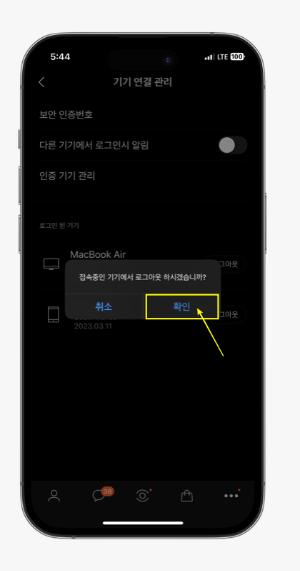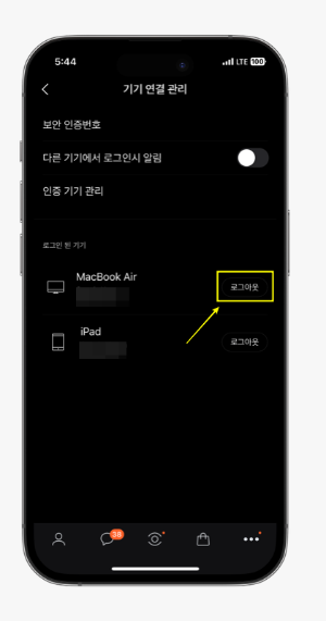 5. 접속중인 기기에서 로그아웃을 한번 더 물어보게 되는데요. 확인하시면 됩니다.6. 로그인이 되어 있던 기기에서 로그아웃이 된 것을 확인 할 수 있습니다.