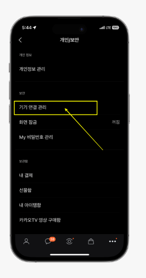 3. 개인/보안에서 기기 연결 관리로 들어갑니다. 4. 접속되어 있는 로그인 된 기기 목록에서 원하는 기기를 원격 로그아웃을 눌러줍니다.