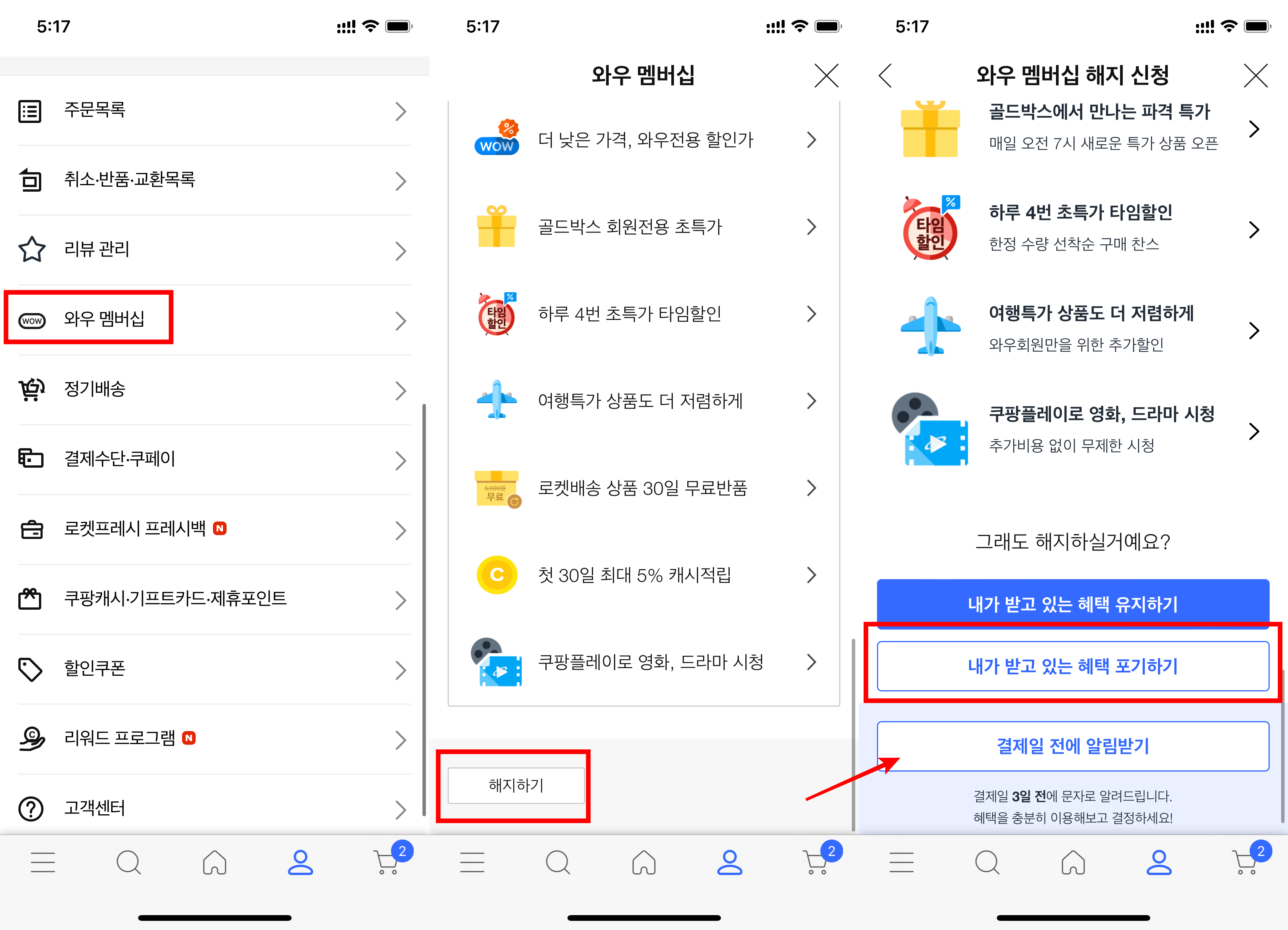 마이쿠팡 - 와우 멤버십 - 제일 하단 해지하기 버튼 - 해택 포기 하기 로 쿠팡와우 멤버십 해지가 가능합니다.