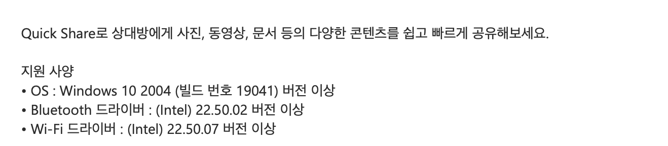 퀵쉐어 설치 사양