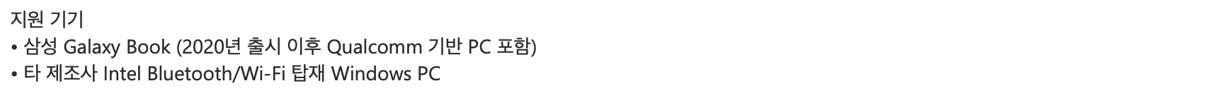 삼성 갤럭시북도 2020년 이후 퀄컴 기반 PC 포함 제품과 인텔 블루투스와 와이파이를 탑재한 노트북, 데스크탑에서도 사용이 가능합니다. 무료 설치는 마이크로소프트 스토어에서 설치가 가능합니다.