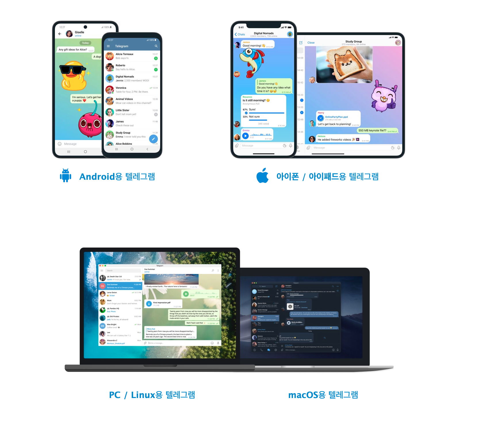 위 텔레그램 다운로드 링크로 접속을 하면 원하는 플랫폼에 맞춰서 무료 다운로드가 가능합니다. 안드로이드, 아이폰, 아이패드, 윈도우, MAC까지 모든 디지털기기에서 다 사용이 가능하며 여러 기기를 사용한다면 동시 접속이 되기 때문에 편하게 사용할 수 있습니다.