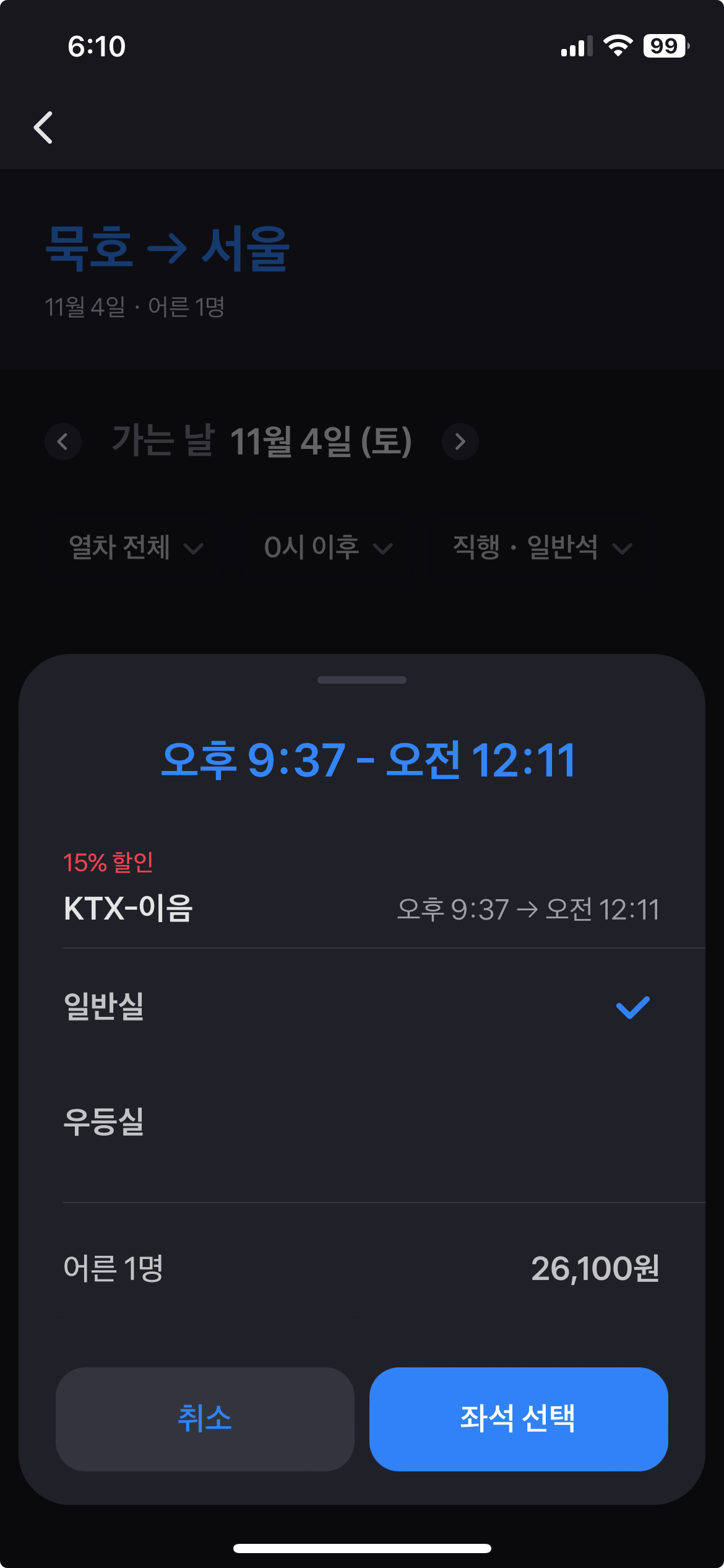 묵호역과 서울역을 한번 선택해서 조회를 해보았는데요.  간편하게 조회와 예매가 가능했습니다. 매진 여부까지 실시간으로 확인까지 가능하네요.  토스로 간편하게 기차표 예매가 가능한 것이 큰 장점이 아닐까 싶습니다.