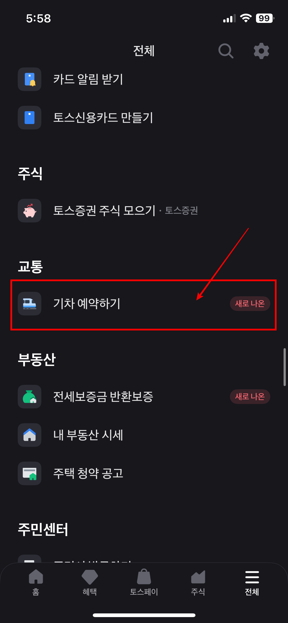 토스 설정에 교통 메뉴가 새롭게 나온 것을 확인할 수 있습니다. 간편하게 기차표를 조회 예매를 한번에 할 수 있으며 따로 코레일 홈페이지에 가입하지 않아도 간편하게 조회 예매까지 가능합니다.