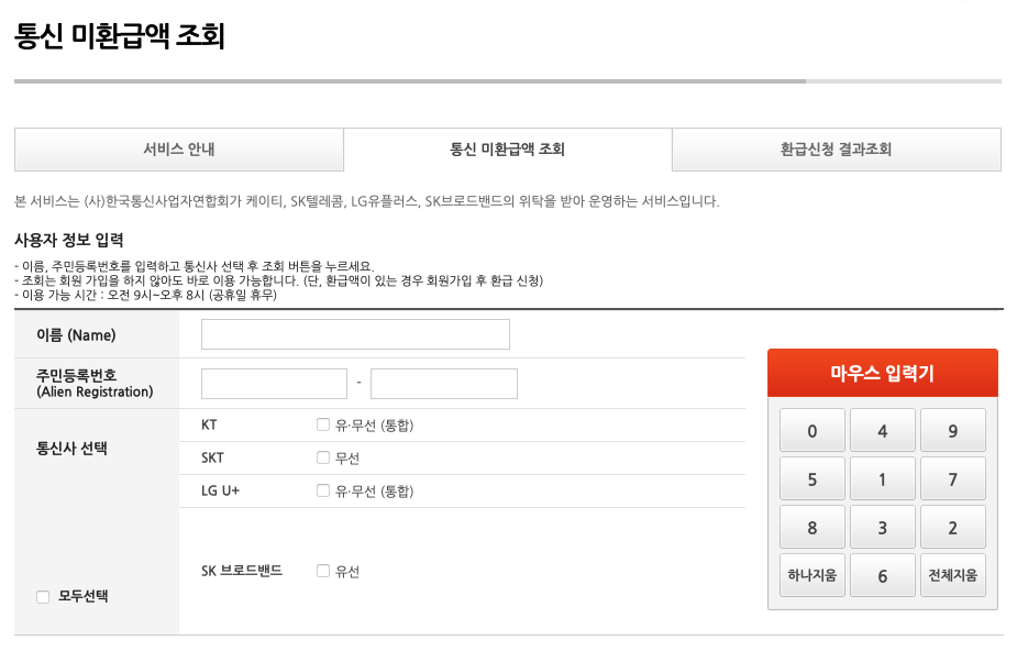 통신 미환급액 조회는 간단합니다. 만약 사용하는 것을 모르신다면 모두 선택해서 조회를 한번 해보시는 것도 좋은 방법입니다. 보통은 사업자를 옮겨가면서 지원금을 받는 분들도 많기 때문입니다.