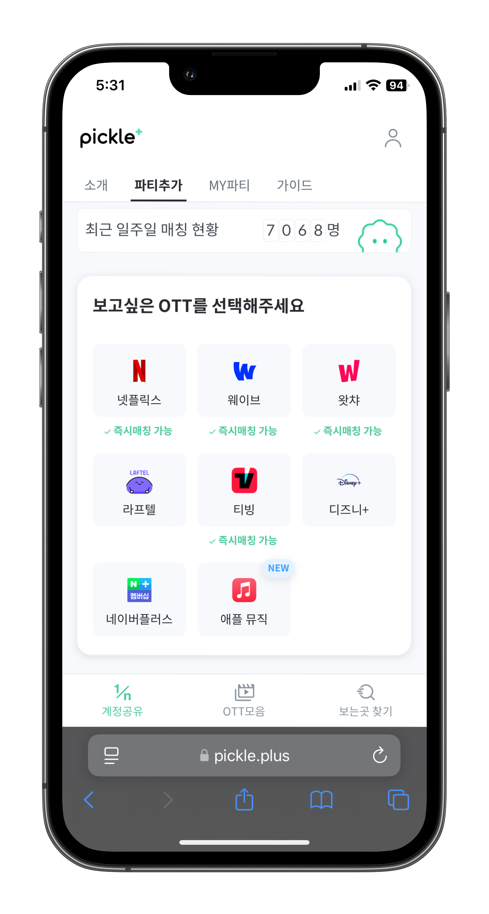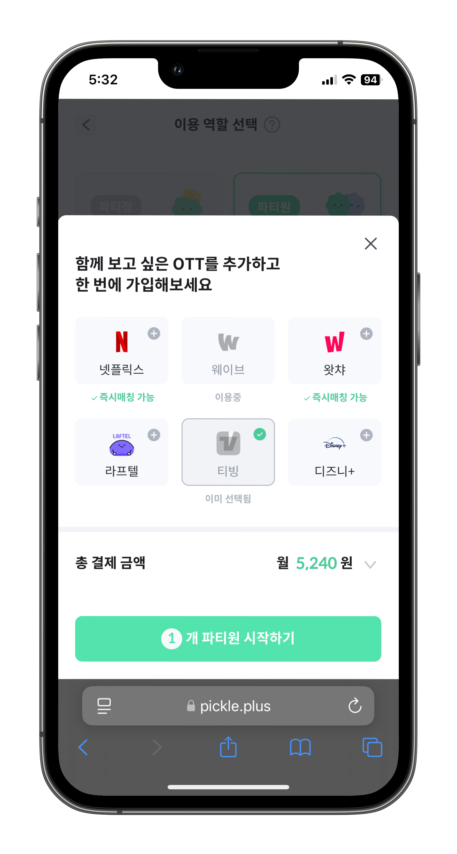 피클플러스는 해외 OTT인 넷플릭스, 디즈니+ 외에도 웨이브, 왓챠, 티빙 국내 OTT를 간편하게 계정공유를 할 수 있는 서비스입니다. 파티장과 파티원으로 구분이 되어 있습니다. 이때 나에게 맞는 상황에 따라 간편하게 가입해서 사용이 가능합니다.