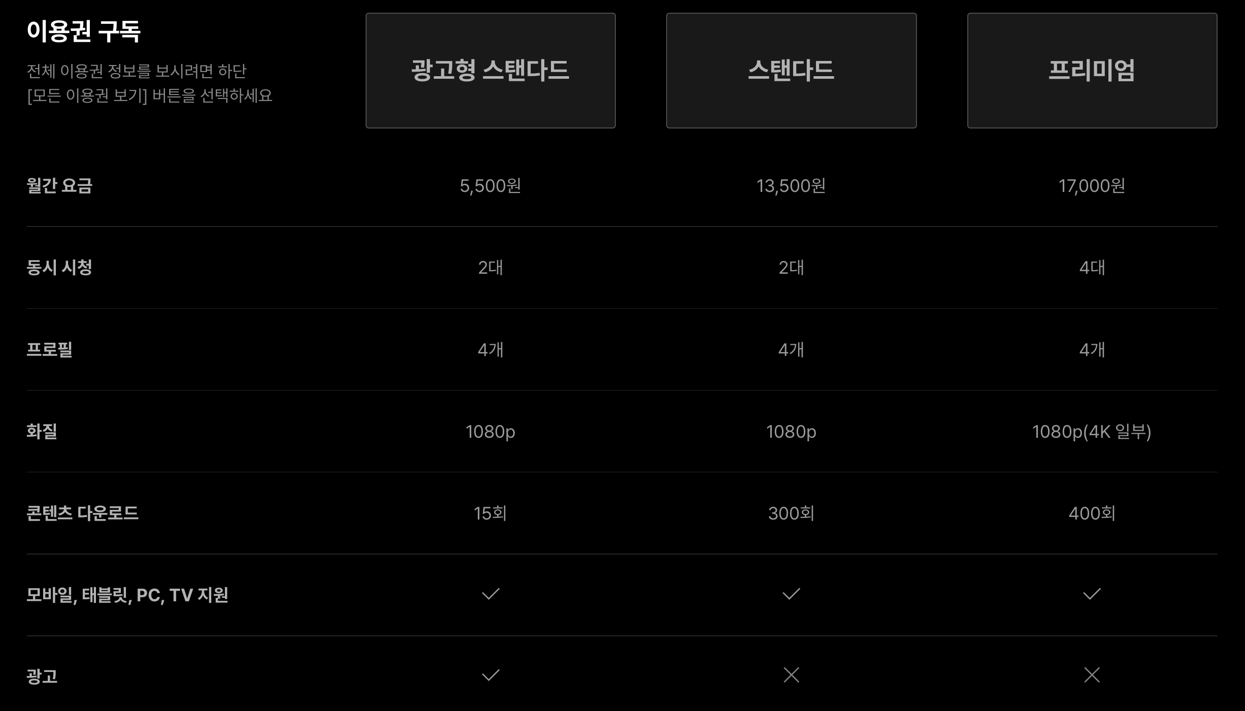 티빙의 요금제는 이전에 베이식 요금제가 없어지고 광고형 스탠다드, 스탠다드 프리미엄 3가지로 서비스가 되고 있습니다. 각 차이는 동시 시청과 화질, 광고 시청 유무가 있습니다.