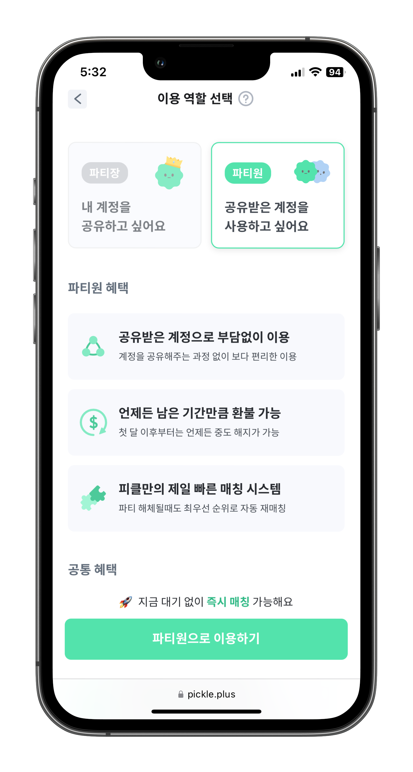 파티원과 파티장의 해택을 확인이 가능합니다. 이때 사용하는 시간만큼 중도해지 환불까지 가능합니다. 그러니 직접 사용해 보고 이용해보시는 것도 좋겠습니다. 물론 이후에 계정공유가 금지가 된다면 피클플러스를 이용해서 가입하면 저렴하게 이용이 가능합니다.