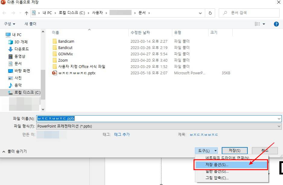 저장 / 다른 이름으로 저장 → 도구 → 저장 옵션