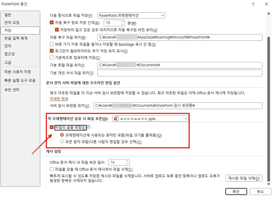 저장옵션에서 중아에 보면 파일의 글꼴 포함에 체크를 한 다음 저장을 하면 됩니다. 모든 문자 포함은 파일 크기가 너무 커지기 때문에 프리젠테이션에 사용되는 문자만 포함에 체크해서 하셔도 문제가 없습니다. 아무래도 파워포인트 파일 용량이 커지게 되면 느린 컴퓨터에서는 파일을 여는 속도가 엄청 느려질 수 있기 때문에 꼭 필요한 글꼴만 포함해서 저장하는 것을 추천드리겠습니다.