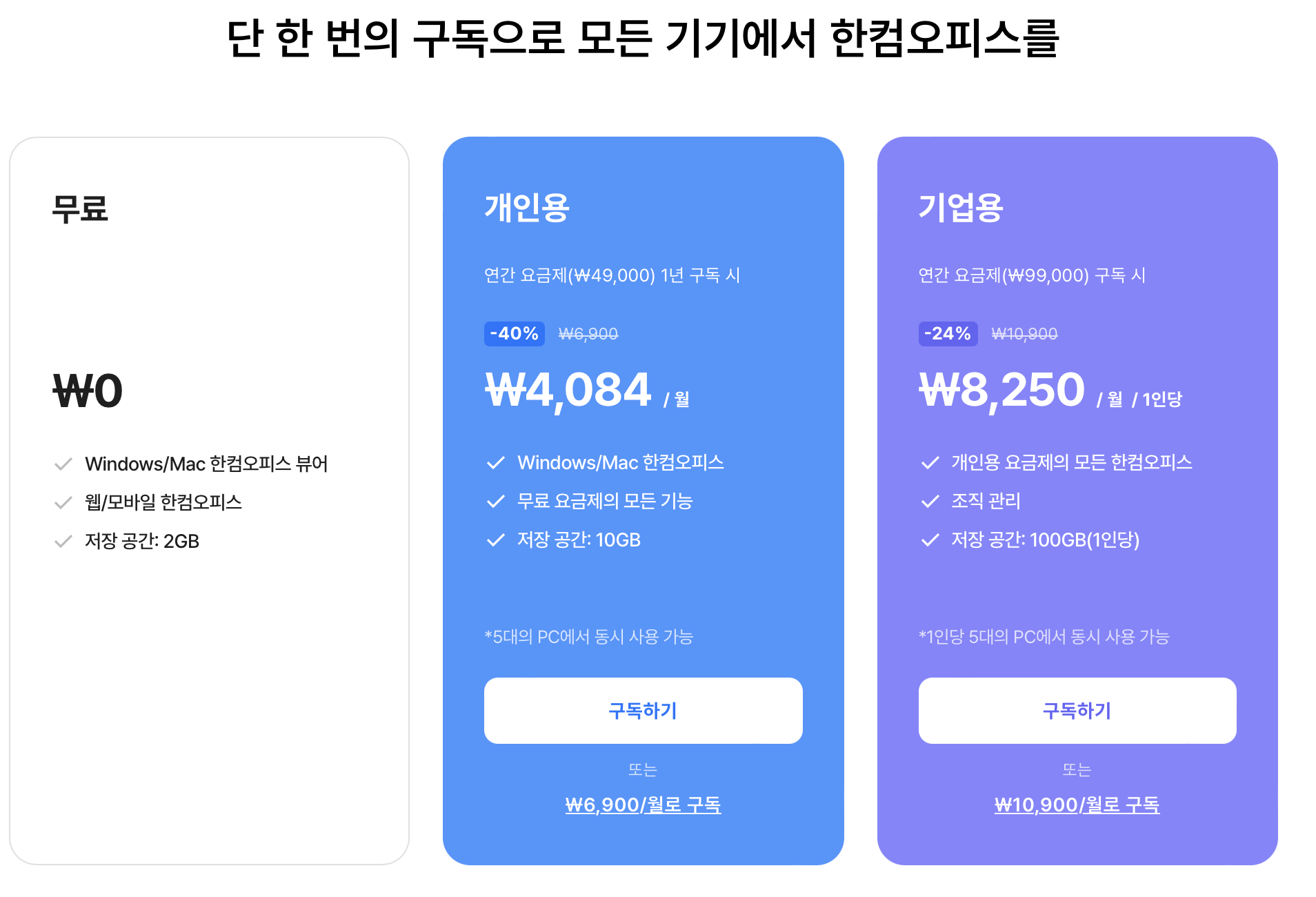2. 한컴독스 요금제를 확인합니다. 한컴독스는 무료, 개인용, 기업용으로 구분이 되어 있습니다. 그런나 개인이 쓰기에는 무료로 쓰는데에도 아무런 문제가 없습니다. 다양한 기기에서 바로 사용이 가능합니다.