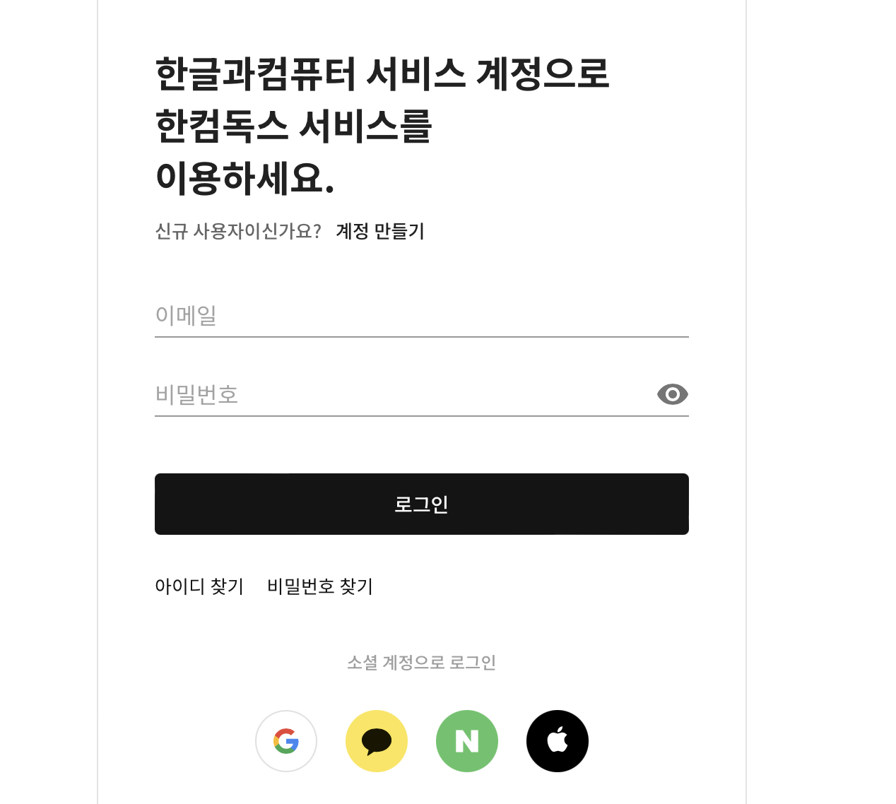 1. 한컴독스 홈페이지에 접속해서 이메일로 가입만 하면 됩니다. 구글, 카카오, 네이버, 애플 간편계정 가입 이용 가능합니다.