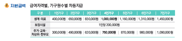 지원금액: 1인가구 40만원 ~ 7인가구 1,450,000원 차등지급