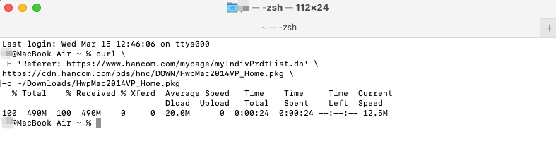 터미널에서 명령어를 입력을 하면 아래 사진과 같이 다운로드가 진행이 되며 기본적으로 다운로드 폴더에 설치파일이 나오게 됩니다.