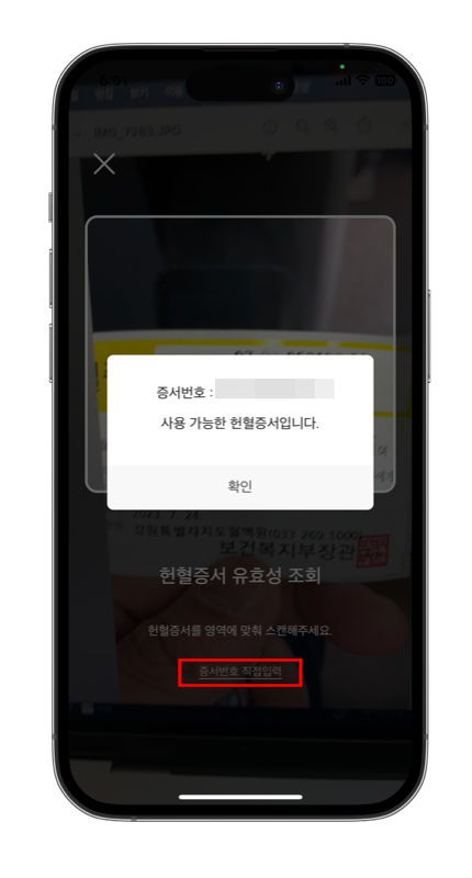 내가 가지고 있는 헌혈증 또는 증서번호가 있다면 쉽게 유효성을 조회할 수 있습니다. 사진을 찍거나 증서번호를 입력하면 됩니다. 유효성이 있는 헌혈증이라면 아래와 같이 사용 가능한 헌혈증이라고 팝업이 나타나게 됩니다.