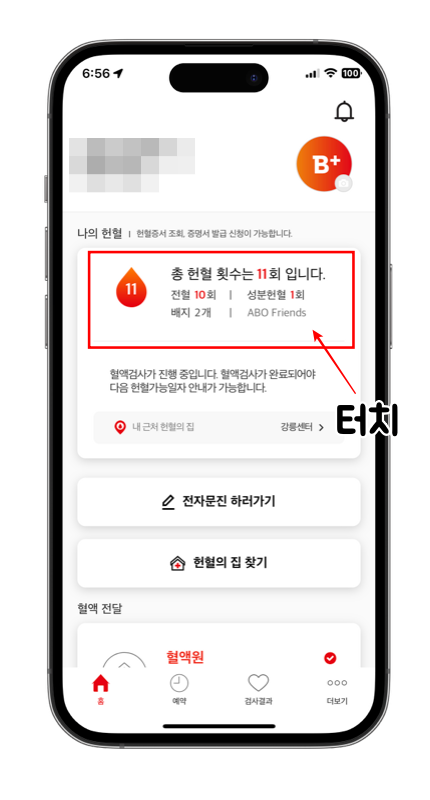 레드커넥트 어플에 들어가서 로그인을 하면 나의 헌혈현황을 바로 확인할 수 있습니다. 그리고 재발급을 받기 위해서는 중앙에 있는 내 헌혈의 횟수를 터치하면 나의 헌혈 정보로 들어갑니다.