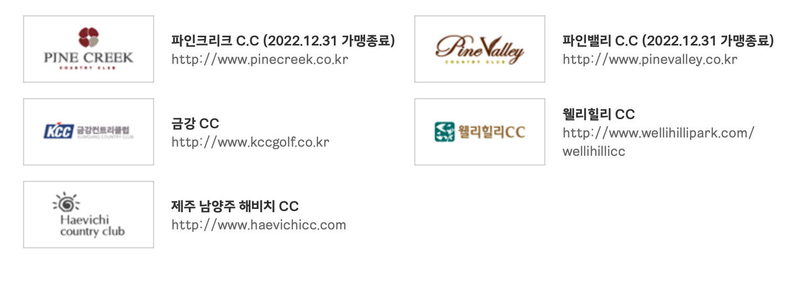 골프장의 경우 가맹이 종료가 되는 곳이 있으니 확인하시길 바랍니다. 파인크리크 C.C, 파인밸리 C.C 두곳은 2022.12.31. 날짜 기준으로 가맹이 종료가 됩니다. 금강CC, 웰리힐리CC, 제주 남양주 해비치CC 세곳은 계속 이용이 가능합니다.