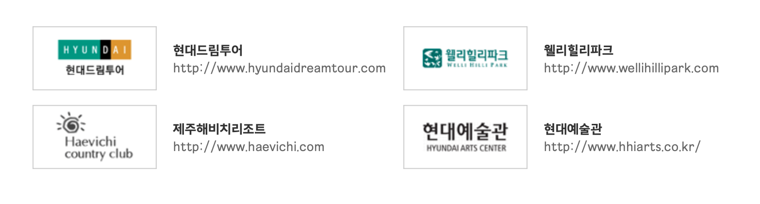 문화 레져의 경우 리조트 위주가 해택을 받을 수 있습니다. 현대드립투어, 웰리힐리파크, 제주해비치리조트, 현대예술관 총 4권데서 사용이 가능합니다.