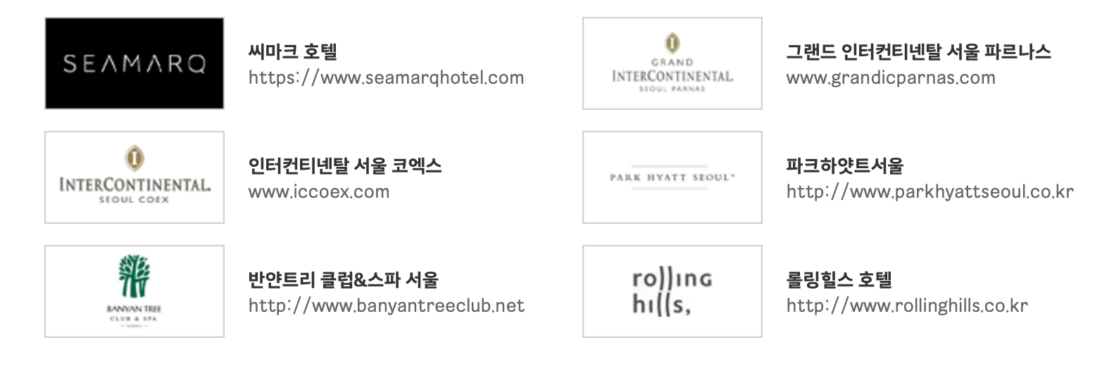 호텔의 경우 현재 6개 호텔이 제휴가 되어 있습니다. 씨마크 호텔, 그랜드 인터컨티넨탈 서울 파르나스, 인터컨티넨탈 서울 코엑스, 파크하얏트 서울, 반얀트리 클럽&스파 서울, 롤링힐스 호텔 입니다.