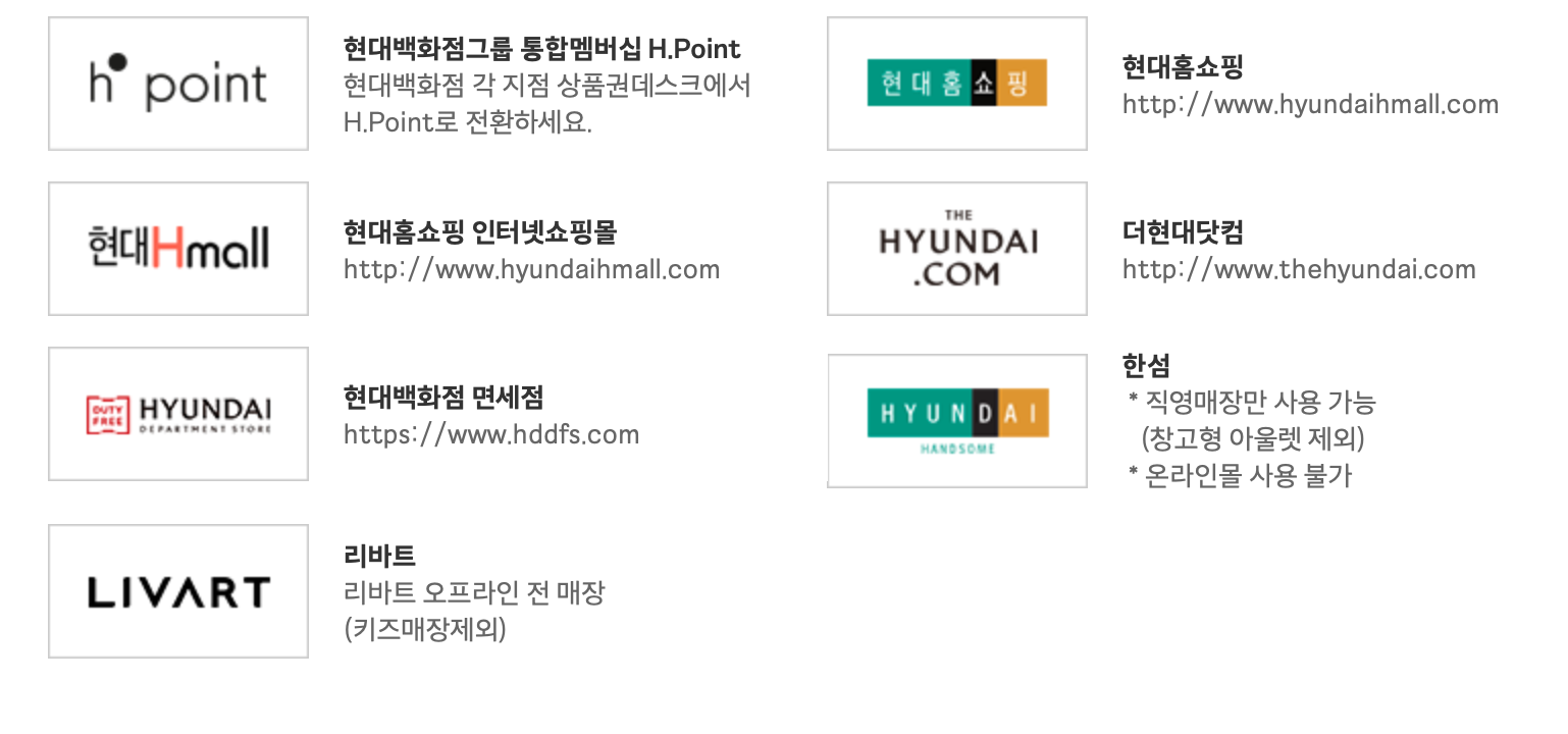 가장 기본이 되는 쇼핑의 경우 현대백화점 16개점, 아울렛 8개점에서 사용이 가능합니다. 오프라인의 경우 한섬 아울렛 직영매장, 리파드 오프라인 전매장(키즈매장 제외) 사용이 가능합니다.