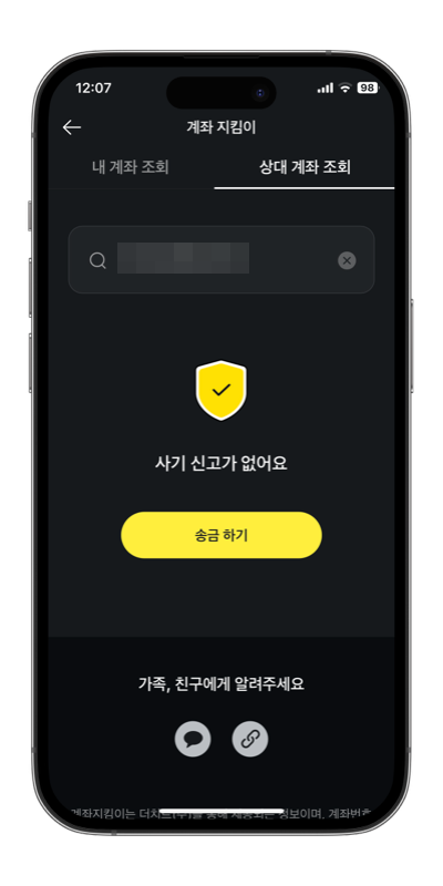 4) 상대 계좌 조회를 합니다. 계좌번호만 누르면 바로 사기계좌인지 확인이 가능합니다. 정말 빠르게 확인이 가능하기 때문에 다른 어떤 사기계좌 조회하는 방법보다 추천하는 방식입니다.