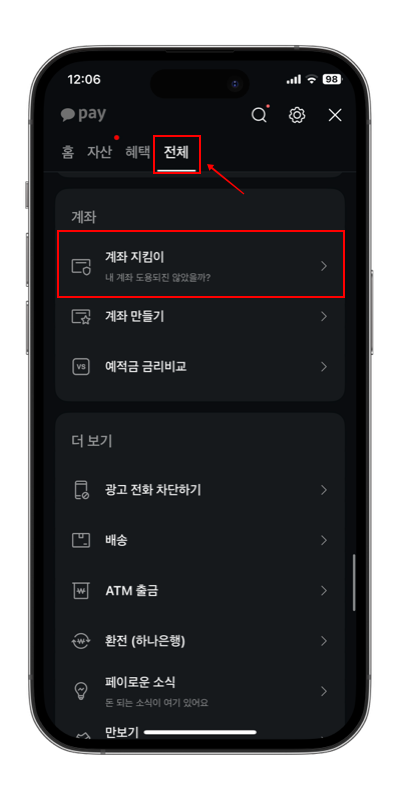 2) 카카오페이 설정 - 전체 - 계좌 - 계좌 지킴이