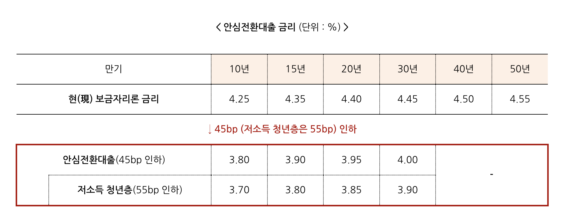 - 보금자리론 대비 45bp 인하, 3.80 ~ 4%, 저소득 청년층 3.7~3.9% 적용 (아래표 참고)