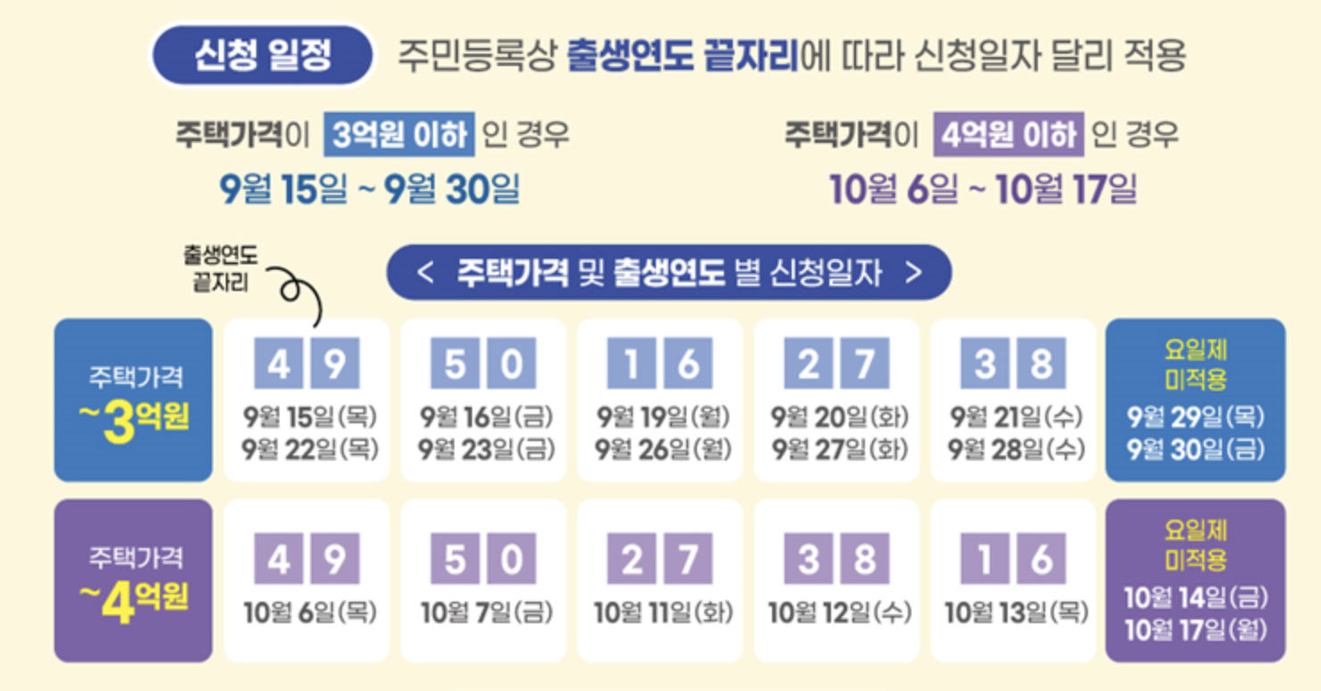 무조건 신청하는 것이 아니라 주택가격, 주민등록상 출생연도 끝자리에 따라 신청일자가 다릅니다. 그리고 선착순이 아니라 주택가격 저가순으로 최종 지원자 선정이 되는 만큼 천천히 알아보고 신청하시면 되겠습니다. 그렇다면 자격과 신청방법은 어떻게 되는지 간단히 알아보겠습니다.