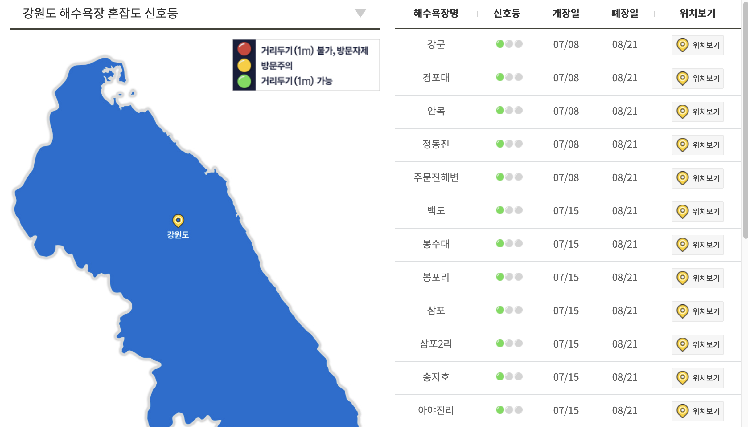 위 링크로 점수로 접속을 하시면 바다여행 만들기 사이트에서 혼잡도 확인이 가능한 전국 지도가 확인이 가능합니다. 현재 서비스가 되고 있는 지역은 강원, 충남, 전북, 전남, 경남, 부산, 울산, 제주 등이며 추가적으로 지역이 늘어날 예정입니다. 가장 많이 가는 곳 중 하나인 강원도에서 확인해 보니 개장일과 폐장일 그리고 혼잡도가 신호등으로 표시 된것을 확인 할 수 있습니다.