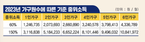 - 가구소득 인정액 중위소득 60% 초과 150% 이하(아래 표 참고)