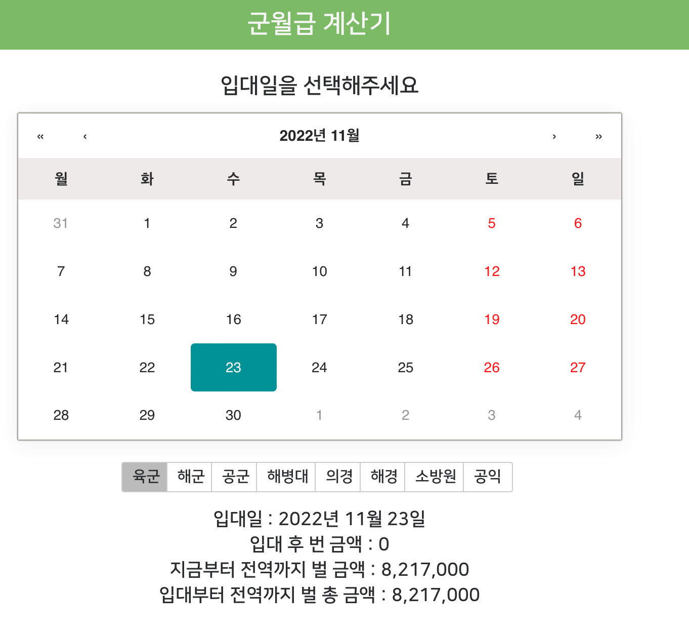 이렇게 되면 군인월급을 입대부터 전역까지 모았을 때 얼마나 될지가 궁금해지는데요. 이는 군월급 계산기 사이트에서 입대일과 어떤 군복무를 한지 선택을 하면 아주 쉽게 계산이 되어서 나오게 되니 참고삼아 해보시길 바랍니다.