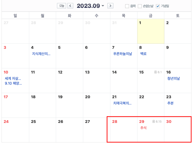 9월에는 추석이 있습니다. 목요일부터 토요일까지까지이지만 일요일이 바로 붙어 있기 때문에 총 4일이라는 엄청 긴 연휴로 쉴수있는 기간이 되겠습니다.
