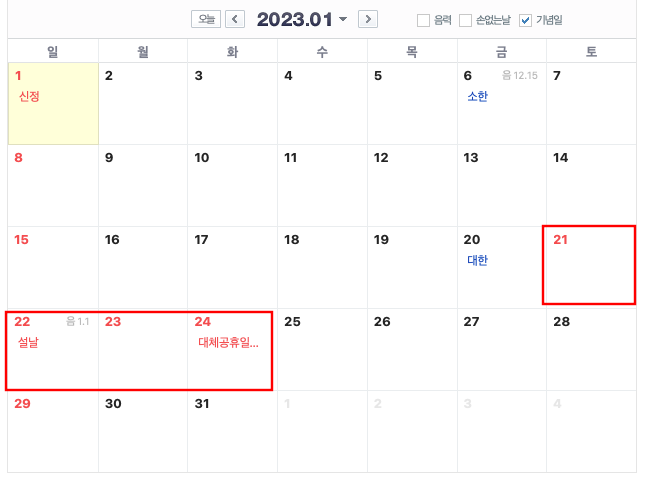 설날(1/21 ~ 24): 총 4일로 대체공휴일이 추가되어 24일까지 쉬게 됩니다.
