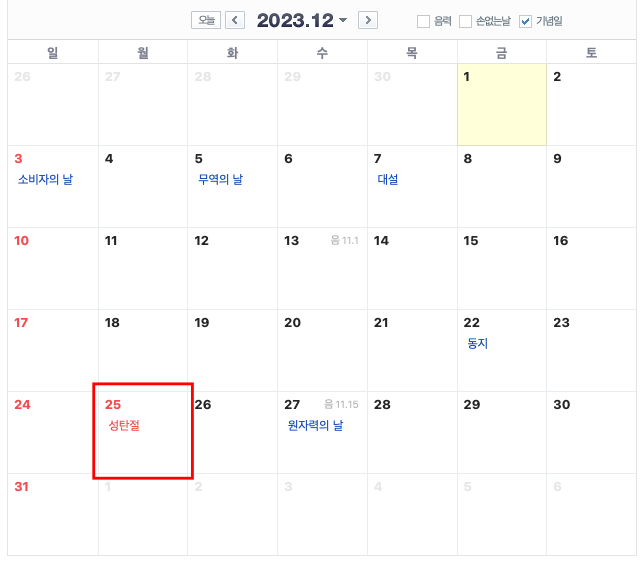 12월은 크리스마스가 있습니다. 대체공휴일이 지정이 가능한 공휴일이지만 월요일인 만큼 따로 지정이 되지 않습니다. 그래도 월요일이라 토일월을 쉴 수 있다는 것이 좋은 연휴입니다.