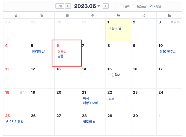 6월은 현충일 하루만 쉬게 되는데요. 화요일이 공휴일인 만큼 월요일을 연차를 사용하면 황금연휴로 만들어서 사용이 가능하겠습니다 .