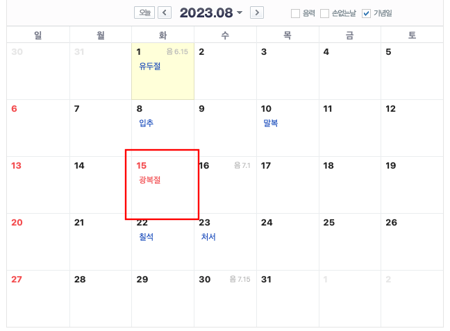 8월은 4대 국경일 중 하나인 광복절만 공휴일입니다. 현충일과 마찬가지로 화요일인 만큼 월요일 연차를 사용하면 사용하시면 황금연휴로 이용이 가능합니다.