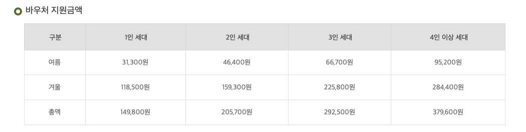 지원금액은 가구수에 따라 달라지게 됩니다. 149,800원 ~ 379,600원까지 차급 지급하게 됩니다. 여름과 겨울 바우처가 따로 되어 있습니다. 여름 바우처 잔액을 겨울 바우처로 사용도 가능합니다.