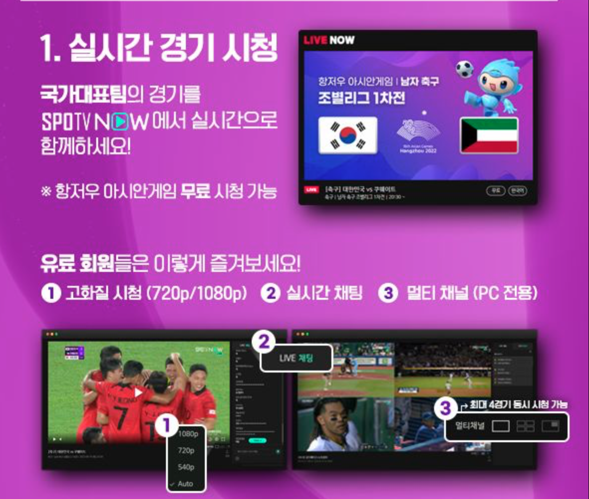 유료로 이용하는 분들은 고화질 설정과 실시간 채팅, 멀티채널(pc판) 까지 이용이 가능합니다. 스포티비 나우는 모바일과 PC 둘다 이용할 수 있는 부분이 장점입니다.