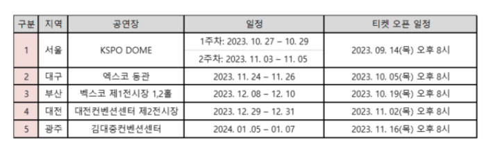 2023 임영웅 전국투어 콘서트 일정을 정리해보겠습니다. 먼저 전국투어 콘서트는 전국 5개 지역에서 열리게 됩니다. 서울은 1차와 2차 두번 개최됩니다. 서울 1, 2차, 대구, 부산, 대전, 광주 순으로 이어지게 됩니다. 매일 각 지역별 3일로 진행이 되며 저녁 1회씩 공연이 됩니다.