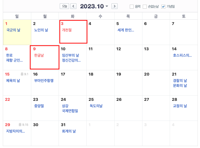 10월은 개천절과 한글날이 있는 국경일이 많은 달이라 할 수 있겠습니다. 화요일과 월요일로 연차를 쓰거나 연속으로 쉬기 좋은 날이네요.
