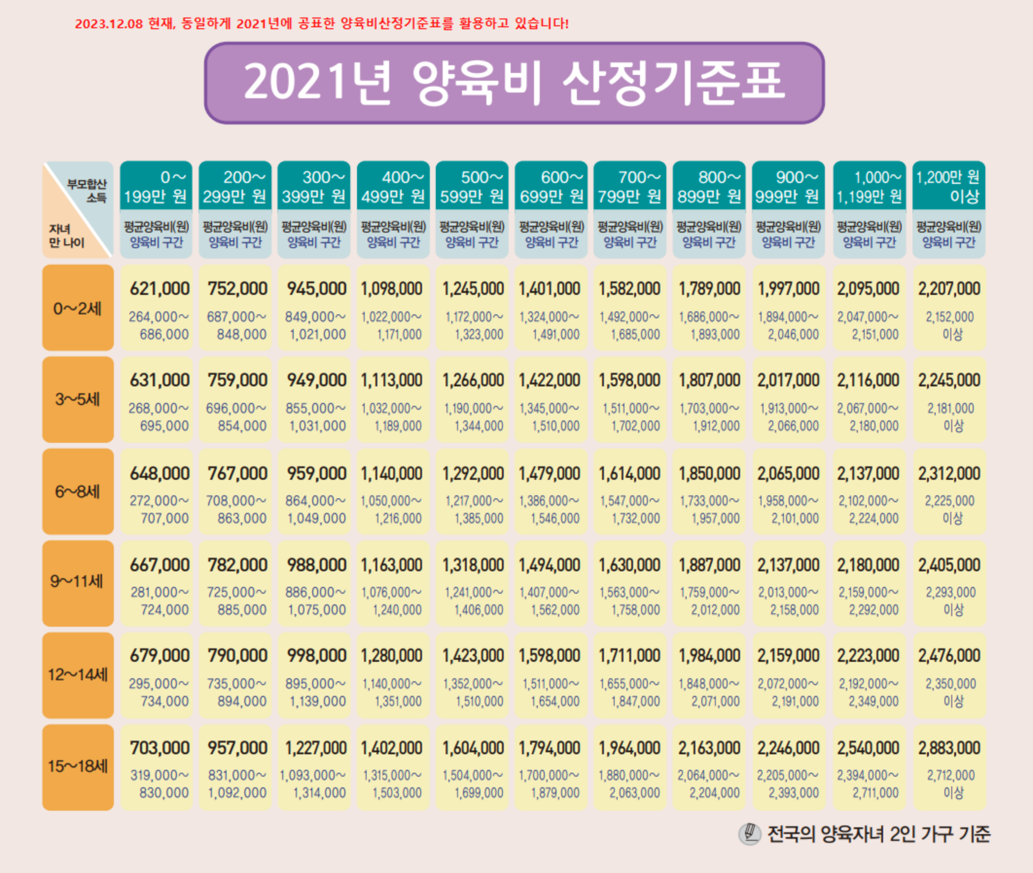 양육비 선정기준표는 매년 바뀌는 것이 아니라 법원에서 공표한 기준을 통해서 이용이 되고 있습니다. 2024년 양육비 산정기준표는 2021년 산정기준표를 기준으로 그대로 적용이 됩니다.